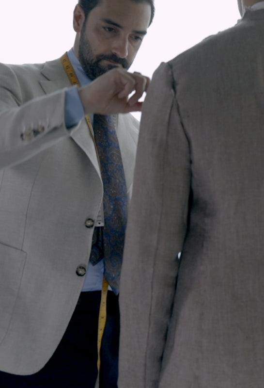 The journey begins with a personal consultation to ascertain what you desire. Time and care are taken to discuss colours, fabrics, style and functionality assuring all elements of your hand made suits will be perfect for you. Our Italian tailors draft your personal pattern with detailed measurements and the astute analysis of your physique and posture. They then hand cut and baste your tailor made suits together for the first fitting. The hand basted fittings are an opportunity to view, discuss and adjust the style, proportions and fit with your bespoke tailor before the suit is completed. Two to three basted fittings are required for the high standard of fit synonymous with the finest hand made Neapolitan suits. The final fitting is with your custom made suits in their completed form for the first time and to your satisfaction.